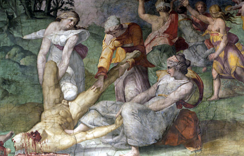 Penthée est alors déchiqueté par les femmes en folie, dont sa propre mère, qui brandit sa tête comme un trophée jusqu’au