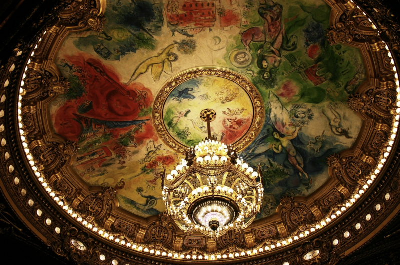 La salle est un troisième espace (4), surmonté d’un grand lustre de cristal (on notera la cheminée pour l’évacuation des fumées avant l’électricité) et couvert d’un plafond peint (par Chagall, maintenant). En rouge et or, avec cinq étages de loges, une série de fauteuils d’orchestre et de fauteuils de corbeille (en tout 2 156 places), la salle doit symboliser le luxe qui, conventionnellement, marque le spectacle lyrique et la danse dans un lieu de prestige.