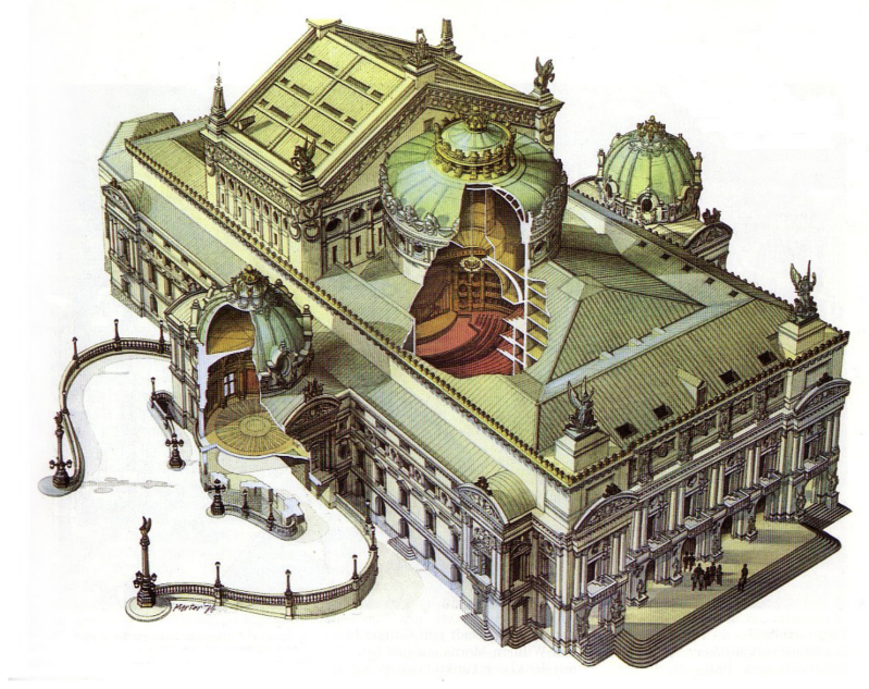 Pour décrire cette image, on imaginera, tout d’abord, que l’extrême droite figure la façade du bâtiment, précédée d’un imposant escalier extérieurqui donne directement sur la place de l’Opéra, aménagée pour l’occasion et située dans le prolongement d’une longue avenue (l’avenue de l’Opéra) et au croisement de deux des Grands Boulevards. Autant dire que le lieu est parfaitement choisi et correspond à un projet urbanistique qui fait de cette salle un « grand monument », en même temps que le centre d’un quartier. Vu de loin, prestigieux, luxueux, l’Opéra Garnier marque la ville, investit un quartier neuf qui, sous le second Empire, se crée afin de lier le centre de la capitale aux quartiers jusqu’ici retirés ou périphériques et à une petite ville, que Paris absorbe, Montmartre. La taille de ce bâtiment est imposante : 172 m de long, 101 m de large, 79 m de haut.