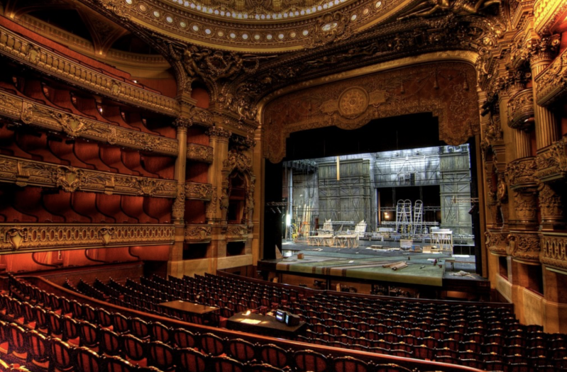 Tout est dans la démesure à l’Opéra Garnier. Sa gigantesque scène pourrait contenir l’arc de triomphe (oui rien que ça !) ! Inspiré des scènes à l’Italienne, Charles Garnier incline la scène de 5% vers les spectateurs. Qu’est ce que ça veut dire ? Tout simplement qu’entre l’arrière de la scène et l’avant il y a une différence d’un mètre ! Cette inclinaison du plateau permet d’offrir une meilleure visibilité aux spectateurs.